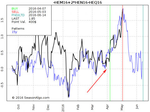 I've got asked a few times about the 3-leg or butterfly spreads we have been trading in Traders Notebook and therefore I want to show you one of our latest trades. What you can see on the seasonal chart below is a butterfly Lean Hogs spread, long 2 contracts in July and short 1 contract in June and 1 short in August. We've entered the spread on June 30 at 0.0 (red arrow), we covered some contracts at 1.000 and we are still holding the last lot using a trailing stop.