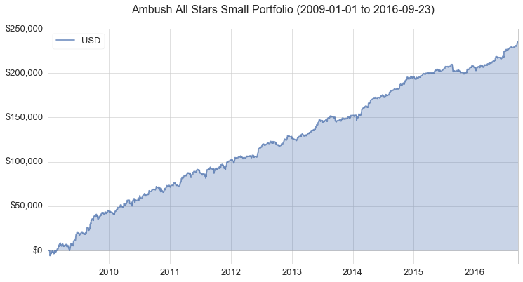 Back in reality, let’s have a look at why it’s the norm not the exception to be in a drawdown as a trader. Here’s the equity curve of trading the Ambush All Stars small portfolio (see this page for more details):