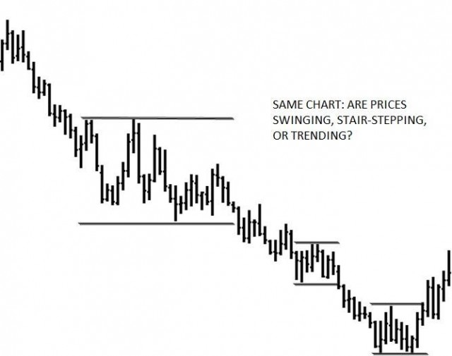 What is the difference between a swing and a trend? I'm not sure! If prices are overall rising or falling, but are doing so by stair-stepping, is it still considered to be a trend? SAME CHART ABOVE AND BELOW.