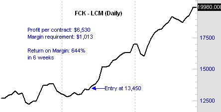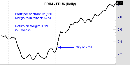 And keep in mind that you can trade 10 times as many spread contracts as you can outright futures contracts. In our example you would achieve a 115 times higher return on your margin.